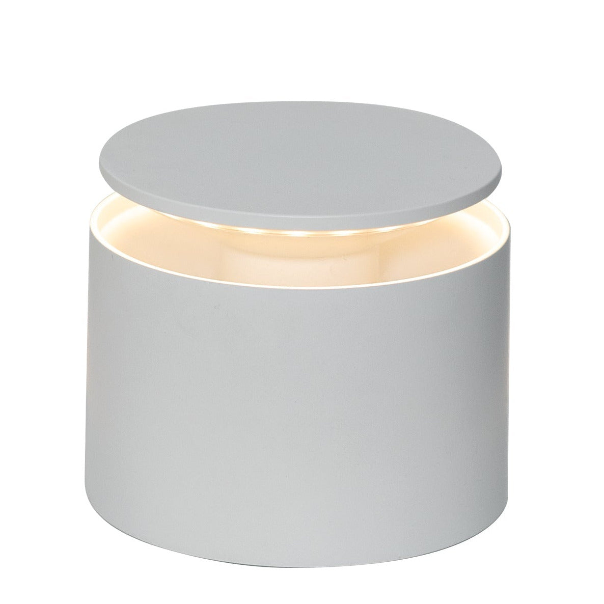 The Zafferano PushUp Pro Lamp Collection features a round, matte blue rechargeable table lamp with a matching lid and a slim gold rim near the top, displayed on a white background.